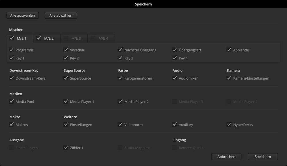 Auf ATEM Constellation Modellen können Sie Ihre Mischereinstellungen jederzeit schnell speichern, um sie später sofort wieder abzurufen. Der Mischer-Schaltzustand wird in einer XML-Datei gespeichert. Zum Vornehmen von Änderungen sind diese Dateien sogar bearbeitbar. Wenn Sie von einem anderen ATEM Modell auf einen ATEM Constellation umsteigen, können Sie beim Einrichten die Einstellungen jedes anderen Modells – sogar von ATEM Minis – als XML-Datei importieren. Das funktioniert alles wunderbar. Den Mischer-Schaltzustand können Sie jederzeit speichern. Alternativ geben Sie über ATEM Software Control vor, ihn in regelmäßigen Abständen automatisch zu speichern und die älteren Dateiversionen aufzubewahren. Beim Speichern des Mischer-Schaltzustands werden neben den Einstellungen auch alle in der Mediathek befindlichen Inhalte mitgespeichert.
