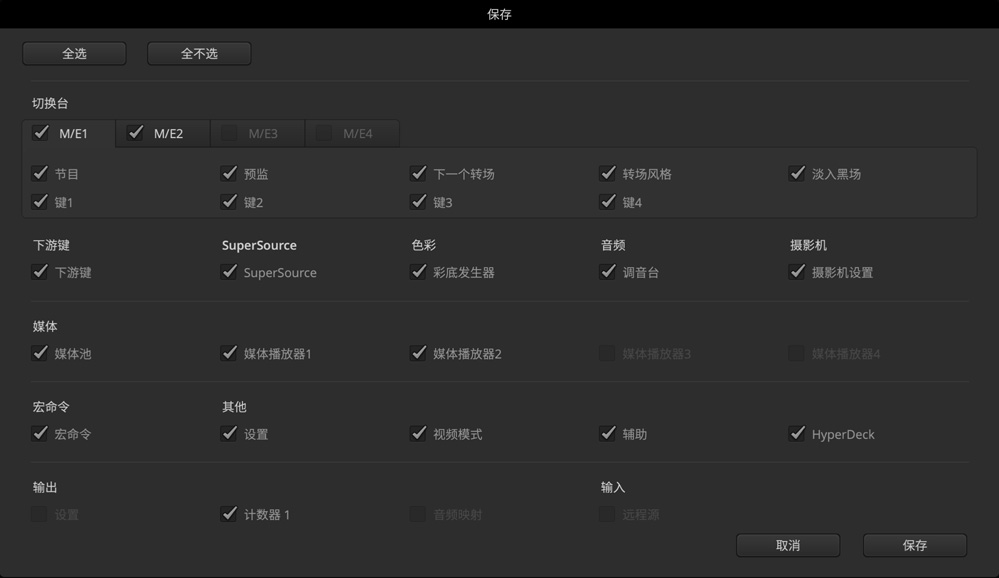 ATEM Constellation能随时快速保存切换台设置,供您即时调用!切换台状态会被保存为XML文件,因此您还可以对其进行编辑加以更改。如果您从其他ATEM切换台转换到ATEM Constellation,可以使用来自其他任何ATEM切换台机型的XML设置,甚至ATEM Mini XML设置文件,就是这么简单!您可以根据需要在任何时候保存切换台状态,也可以对ATEM Software Control进行设置,让它每隔一段时间执行自动保存,较早的文件版本也都会完整保留下来。保存切换台状态时,您不仅能保存其各项设置,还能保存媒体池中的所有内容!