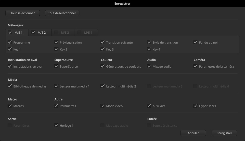 L’ATEM Constellation vous permet de sauvegarder la configuration de votre mélangeur à n'importe quel moment et de la rappeler en mémoire instantanément. L’état du mélangeur est sauvegardé dans un fichier XML, que vous pouvez modifier. Si vous commencez à utiliser un ATEM Constellation, vous pouvez utiliser les configurations XML créées sur les autres mélangeurs ATEM, dont l’ATEM Mini. Les fichiers sont compatibles entre les différents modèles ! Vous pouvez sauvegarder l’état du mélangeur à n’importe quel moment, ou régler l’ATEM Software Control pour effectuer des sauvegardes automatiques régulières, en conservant les anciennes versions. Lorsque vous sauvegardez l’état du mélangeur, vous conservez tous les réglages mais également le contenu de la bibliothèque de médias.