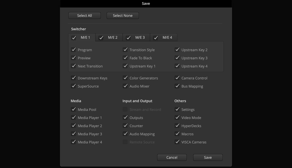 ATEM Constellation lets you quickly save your switcher set up at any time which means you can recall it instantly! The switcher state is saved as an XML file so you can even edit the files to make changes. If you're transitioning to ATEM Constellation from another ATEM switcher, then you can use the XML setups from any other model of ATEM switcher, even an ATEM Mini XML setup file! It all just works! You can save the switcher state any time you like, or you can setup ATEM Software Control to auto save at regular intervals and the older versions of the files are kept. When saving the switcher state, you save not only the settings, but all of the media pool contents as well!