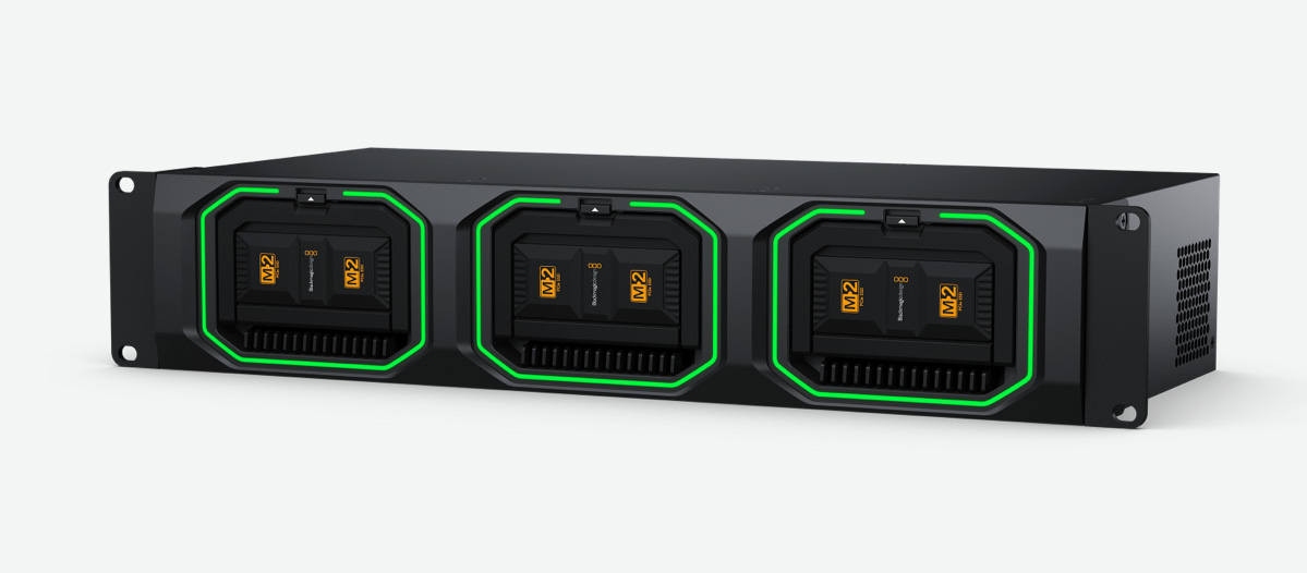 Mount up to 3 Blackmagic Media Modules in a 2RU rack mount design. Includes HDMI monitoring output, illuminated LED rings showing reads and writes, plus a built in 4-port 10G Ethernet switch.