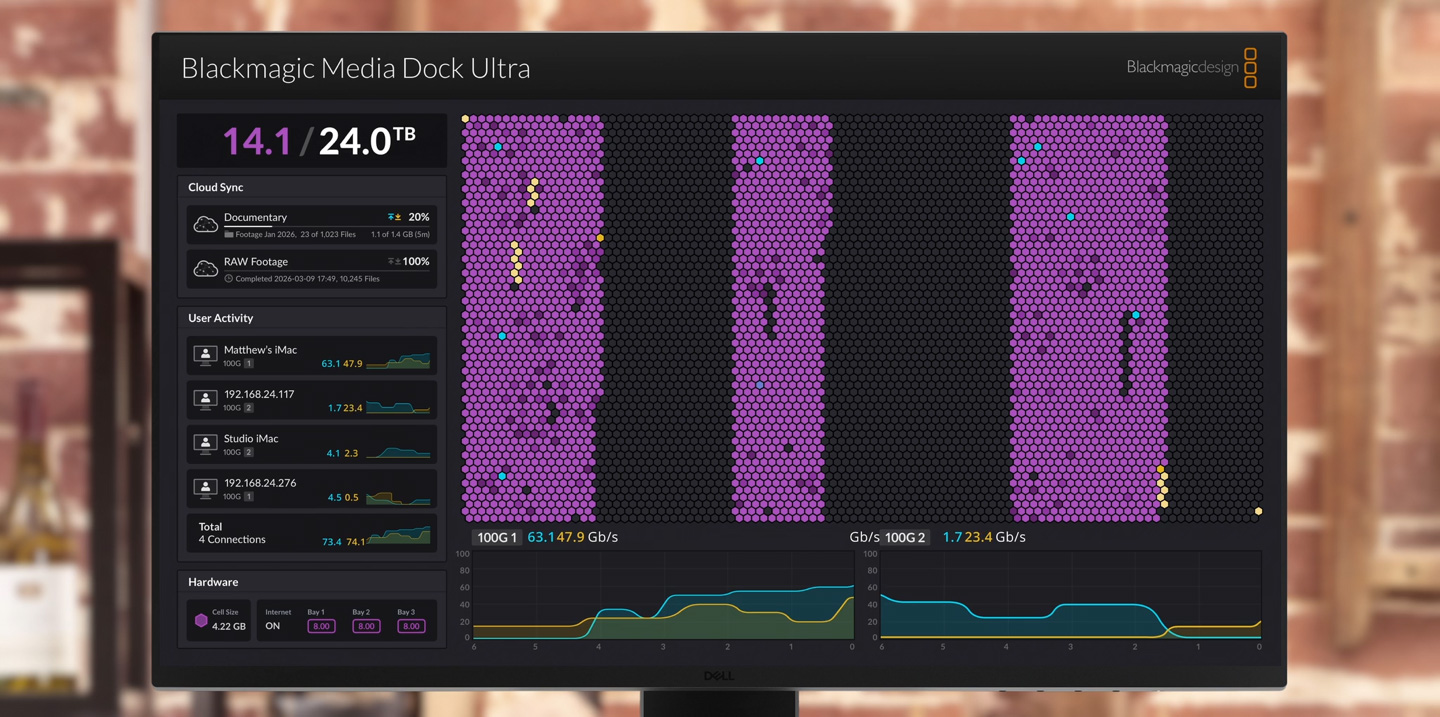 The most exciting feature is the HDMI and SDI monitoring outputs! Simply connect a monitor to get a live status overview of the Blackmagic Media Dock! The storage map shows a graphic representation of the modules total capacity and also shows reads and writes for the connected users. It’s mesmerizing to watch! There are also graphs that show you the data transfers on the Ethernet connections. The main space indicator shows you the capacity of the media modules and how much is currently being used. You can also add a custom name to the Blackmagic Media Dock! The status for each Blackmagic Cloud sync is also shown. It's even possible to view the status of the power supplies!