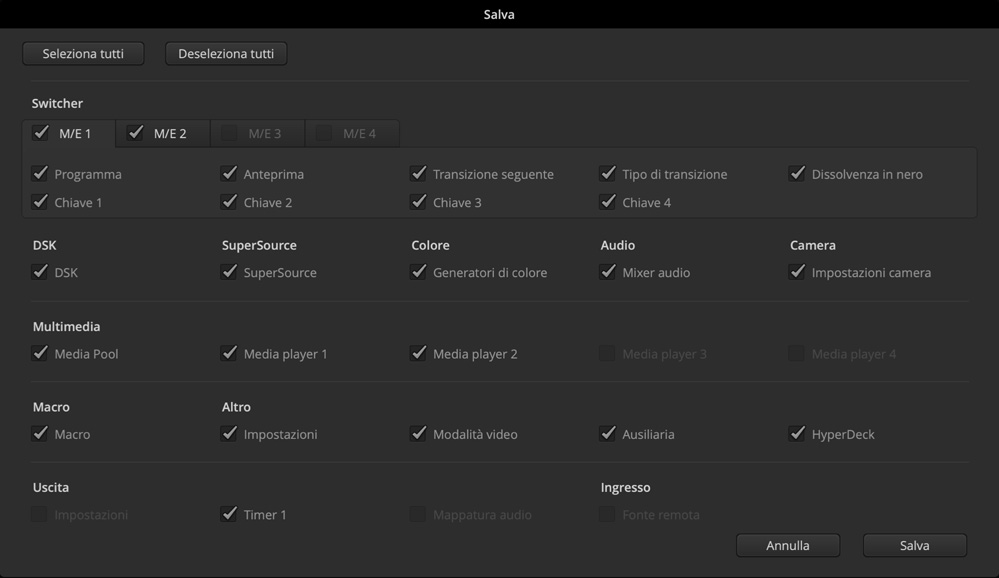 La configurazione di ATEM Constellation si può salvare e ripristinare in qualsiasi momento! Lo switcher la salva come file XML, che puoi modificare per apportare cambiamenti. Se passi ad ATEM Constellation da un altro switcher ATEM puoi riutilizzare le configurazioni XML di qualsiasi altro modello, anche ATEM Mini. Funziona con tutto! Puoi salvare la configurazione dello switcher in qualsiasi momento oppure attivare la funzione di autosalvataggio a intervalli regolari su ATEM Software Control, conservando le versioni precedenti dei file. La configurazione salvata mantiene intatto anche il contenuto del Media Pool!