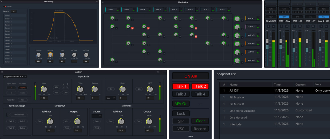 統合されたオーディオ・フォロー・ビデオ(AFV)コントロールは、カメラ切り替えをオーディオミックスに直接リンクし、チャンネル、バス、VCAに割り当てられた最大100台のカメラをサポートします。あらゆる信号経路を1台のカメラからコントロールでき、フェーダーの前にレベルコントロールを行うことで正確なゲイン・ステージングが可能です。フェーダーカーブとホールドタイムを設定して、滑らかで自然なトランジションを実現できます。AFVは、選択したアクティブカメラを介してATEMスイッチャーから直接実行できるため、常にオーディオをビデオと同期できます。このワークフローは、トーク番組に最適です。司会者とゲストの映像を切り替える際に適切なマイクが自動的にミックスに送信されるので、明瞭でバランスの取れた会話を維持できます。継続的に手動で調整する必要はありません。