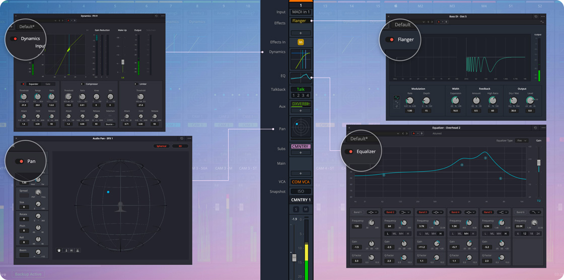 モノおよびステレオから、LCR、5.1、そして完全なイマーシブ・アンビソニックスまで、Fairlight Liveは様々なフォーマットで、数百から数千の入力チャンネルをサポートしています。各チャンネルには、EQ、ダイナミクス、パンのオプションが搭載されており、入力レベル、配置、明瞭さをコントロールできます。汎用性の高いフォーマットベースのパン機能には、1D、2D、3Dに加え、アンビソニックスおよび空間オーディオ用の球面パンナーが含まれます。ミキサーの処理コントロールをダブルクリックするとコントロールウィンドウが開き、Escapeを押すと閉じます。ワークフローでプラグインを使用する場合、各チャンネルに4つのエフェクトスロットが付いており、ChainFXが各スロットで6つのプラグインをホストするので、各チャンネルで最大24のプラグインを使用でき、お気に入りのネイティブおよびサードパーティ製のVSTエフェクトやAUエフェクトを使用できます。