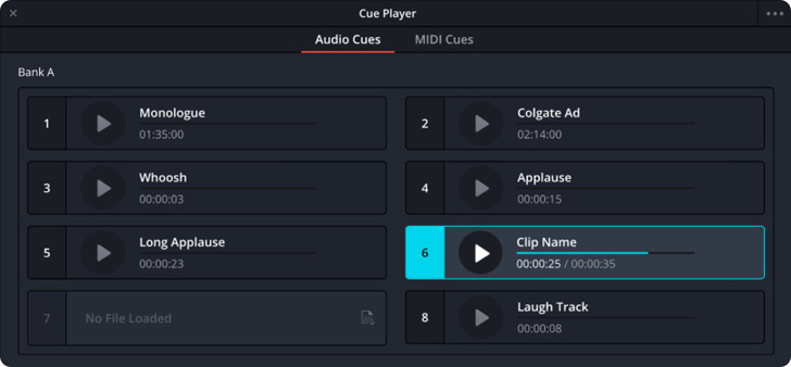 Fairlight Liveは、2種類のキューに対応したキュープレーヤーを内蔵しています。ジングル、カート、スティンガー用の16のオーディオキュー、そして照明やスモークマシーンなどのハードウェアをコントロールするための16のMIDIキューがサポートされています。各キューは、ユーザー定義のキーボードショートカット、Fairlight Liveコンソールのキューボタン、またはサードパーティ製のMIDIコントロールからトリガーできます。これにより、ライブプロダクション中に正確なタイミング調整が可能です。生のトーク番組では、プロデューサーがメインミックスを中断することなく、瞬時にオンエアライトを点灯してイントロ用のジングルを再生できます。これにより、ライブプロダクション中のキュー再生の一貫性、再現性、そして管理の容易性が保たれ、放送中の誤操作のリスクが低減します。
