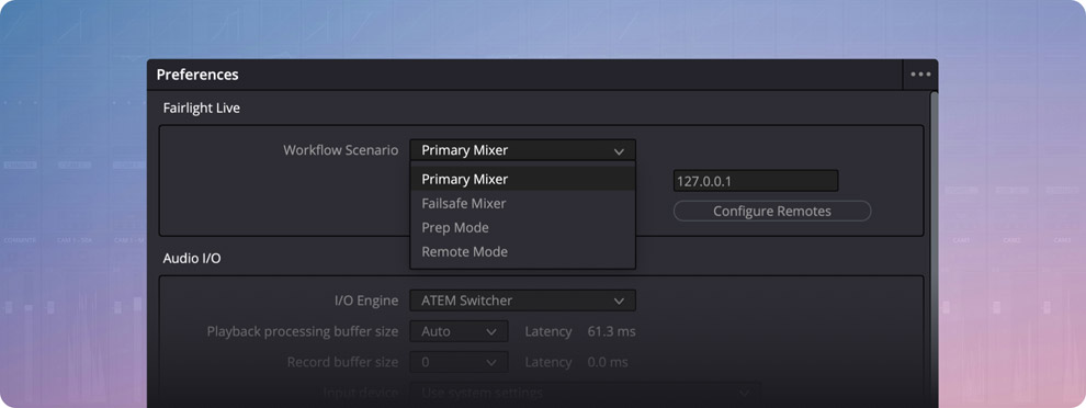 プライマリーエンジンとバックアップエンジンに加え、Fairlight Liveは別のコンピューターからもミックスをコントロールできるので、複数のシステムで操作が可能。ミックスの一部をメインシステムからリモートのオペレーターに委託することができ、リモートのオペレーターは割り当てられたチャンネルやパラメーターをリアルタイムで更新できます。このシステムは2つの同時リモートコントロール機器をサポートしており、同期状況を表示するインジケーターと専用のトークバック機能を備えています。このようなワークフローは、スポーツ中継や礼拝、トーク番組などに最適です。一人のスタッフがメインプログラムを管理し、他のスタッフが別の場所から観客用マイクやインイヤーモニターを操作することで、ライブプロダクション中のミックスの管理と迅速な対応が可能です。
