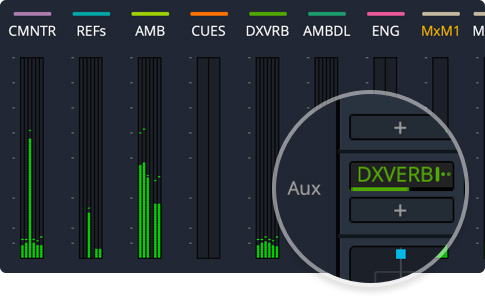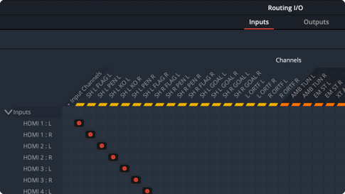 Fairlight Liveでは、ステレオから5.1サラウンド、あるいはイマーシブフォーマットまで、あらゆるプロジェクトに最適な柔軟性の高いオーディオワークフローに対応した独自のミキサーを簡単に設計できます。入力やバスをいつでも追加、修正、移動可能。4人のホストによるトーク番組をリモートのゲスト用セットアップに簡単に変更したり、ステレオ入力をアンビソニックスバスに瞬時にルーティングできます。ミキサーのチャンネル番号を右クリックするだけで、入力を更新できます。また、ウィンドウメニューを使用して、バス管理やI/Oパッチングを行うことも可能。オーディオチャンネルはトラックインデックスで管理でき、入力やバスの表示/非表示の切り替えや並べ替えもできます。さらに、豊富なネイティブ・プラグインライブラリ、EQ、ダイナミクスに加え、サードパーティ製のAUおよびVSTプラグインにも対応しており、ミキシングをパワーアップできます。