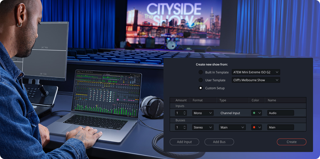 Fairlight Liveは、ATEMライブプロダクションスイッチャーと使用するよう設計されており、USB経由で接続して直接コントロールしたり、オーディオを変更したりできます。最大100台のカメラからオーディオ・フォロー・ビデオ(AFV)のカメラを選択でき、オーディオをスイッチャーからミキサーにルーティングして、プログラム出力に戻す前に処理およびミキシングを実行できます。双方向マイクのゲインコントロールにより、トークバックおよびソロモニタリングを管理でき、システム間で一貫したオーディオレベルを維持できます。サポートされているATEMモデルには、デフォルトのミキサー設定およびテンプレート、完全なオンエア状況コントロールが含まれます。つまり、マルチカムプロダクションでは、カメラを切り替えると自動的に正確なオーディオがオーディオミックスに送信されます!