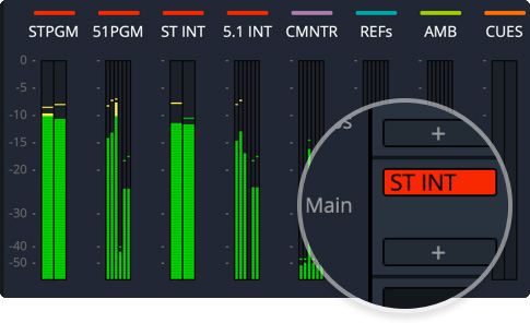 メインバスは、放送または配信用の最終出力ミックスを管理します。これには、異なる言語や解説に対応した国際バージョンと、ラウドネス規格への準拠が含まれます。ライブのスポーツ映像をメインバスにルーティングし、英語版の国際映像を作成してLUFSレベルをモニタリングできると想像してみてください。