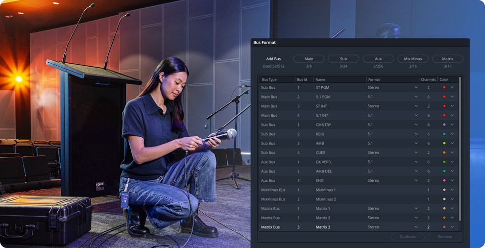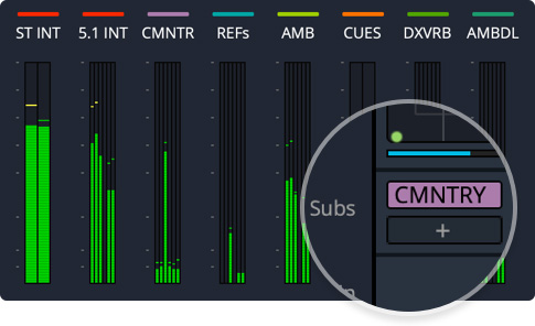 Fairlight Liveでは、標準フォーマットの柔軟性の高い信号経路を使用してバス構成をカスタムメイドでき、番組の展開に合わせて動的に追加、変更、再配置できます。ウィンドウメニューからバス管理ウィンドウを使用して、メイン、サブ、Aux、ミックスマイナスバスを追加し、フォーマットや名前、カラーを選択します。入力からバス、あるいはバスからバスへのルーティングは、バス割り当てウィンドウまたはミキサー内で直接設定できます。複数のミキサーチャンネルを同時に設定することで時間を節約可能。内蔵インテリジェンスは、異なるフォーマット間の互換性を得るために、自動的にバスのアップ/ダウンコンバージョンを実行します。解説はメインバス、観客マイクはサブバス、出演者のインイヤーフィードはミックスマイナス、そしてカメラのフォールドバックはAuxバスにルーティングできます。