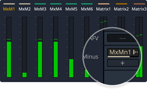専用のミックスマイナスバスは、トークバックフィードを送信します。独立したレベルおよびパンコントロール、そしてプリフェーダーおよびポストフェーダー・ルーティングに対応。生放送において、コメンテーターはハウリングを防ぐために、プログラムミックスやその他のコメンテーターの音声から自分の音声を削除できる一方で、プロデューサーや出演者とのコミュニケーションを維持できます。