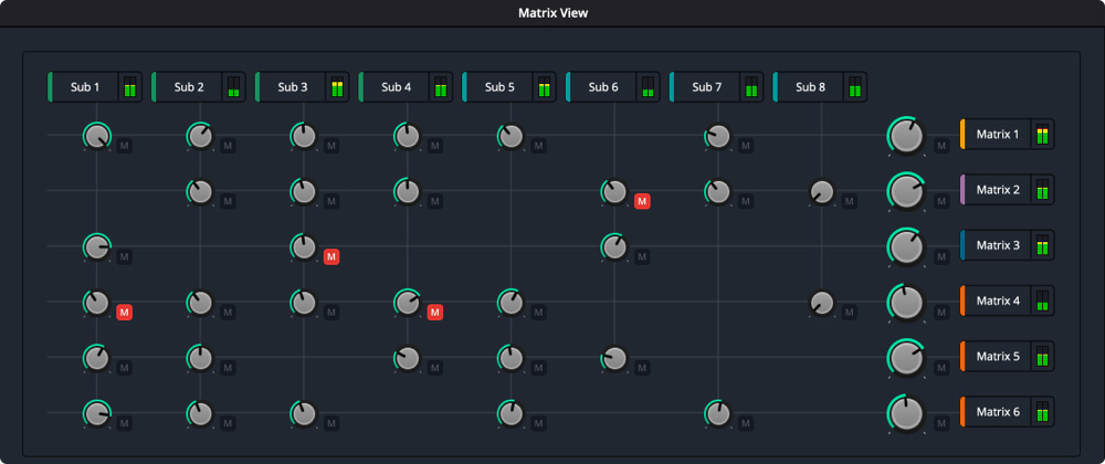 出力マトリックスバスを使用すると、メインのプログラムミックスに変更を加えることなく、ステージモニター、中継フィード、収録デバイスなど、複数の別々の送信先に独自のミックスを送信できます。この多機能出力は、他のバスからオーディオを受信し、複雑なライブプロダクション用にフィードをカスタマイズするためのライブオーディオソリューションです。Fairlight Liveは最大8つの同時出力ミックスに対応しており、正確なレベルコントロールですばやいマトリックス設定とルーティングが可能なので、ミックスをバランス調整して、ライブ配信、中継車、リモート制作チームなどに送信できます。すべてが動的に管理されるので、すべての出力においてリアルタイムで一貫性を保つことができます。