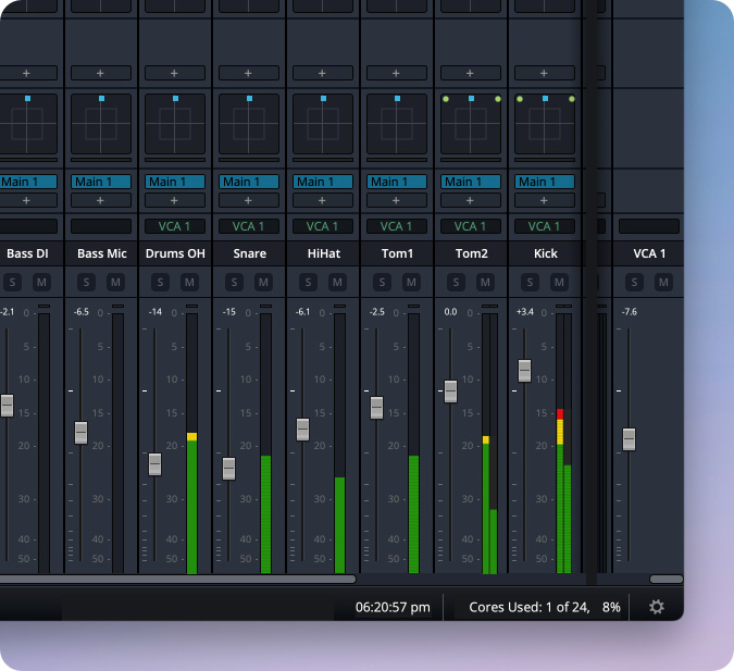 ミックスを効率化する必要がある場合、VCAマスターを使用すれば、1つのフェーダーで複数のチャンネルおよびバスの相対的なボリュームをコントロールできます。Fairlight Liveは最大128のVCAグループをサポートしており、番組設定ダイアログにはフェーダーの動作やミュート/ソロのオーバーライドのオプションがあります。ミキサーチャンネルのVCAフィールドをクリックすると、VCAグループの割り当て、インデックス内のグループの名前付け、VCA割り当てウィンドウ内のVCAの管理が可能。これらは、司会者用マイクや、スタジオバンドのドラムの全入力など、一般的な入力を素早く調整するのに適しています。また、ネスト化されたVCAもサポートしているので、1つのVCAマスターですべてのコメンテーターマイクをまとめて調整できる一方、ネスト化されたVCAで実況放送のコメンテーターを個別にコントロールすることもできます。