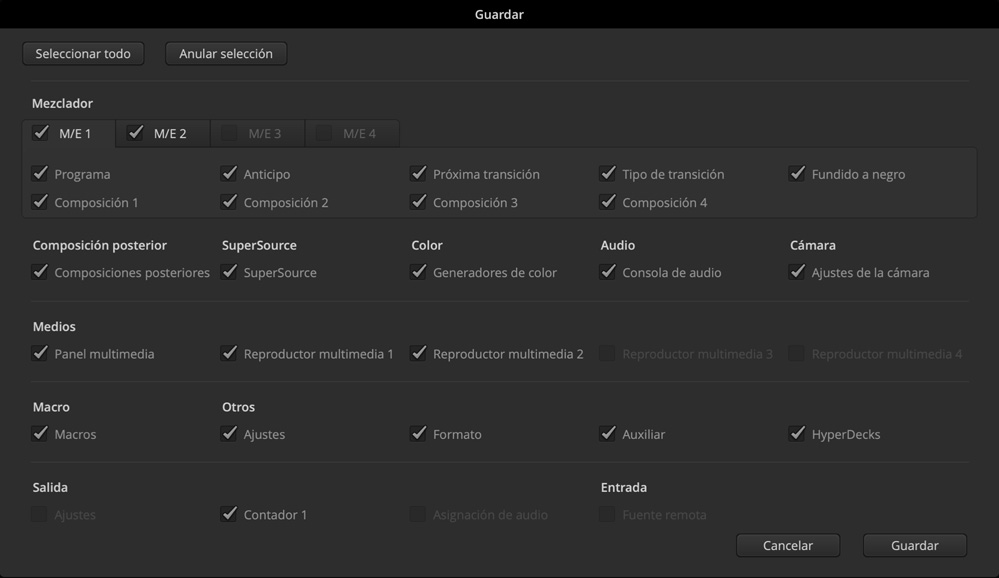 Es posible guardar una determinada configuración del mezclador en cualquier momento para volver a utilizarla con posterioridad. Esta se almacena en un archivo XML que puede modificarse para emplearlo en otros dispositivos de la línea ATEM, incluido el modelo ATEM Mini, sin ninguna dificultad. Asimismo, el programa ATEM Software Control permite guardar la configuración del dispositivo a intervalos regulares, conservando las versiones anteriores. Cabe destacar que el contenido del panel multimedia se almacena en el mismo archivo.