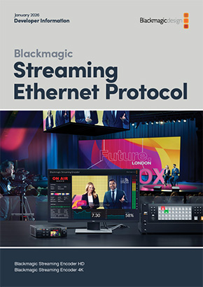 This PDF document provides information for developers on the Blackmagic Streaming Encoders Ethernet Protocol. It describes the text based protocol to control Blackmagic Streaming Encoders products over a networked connection.