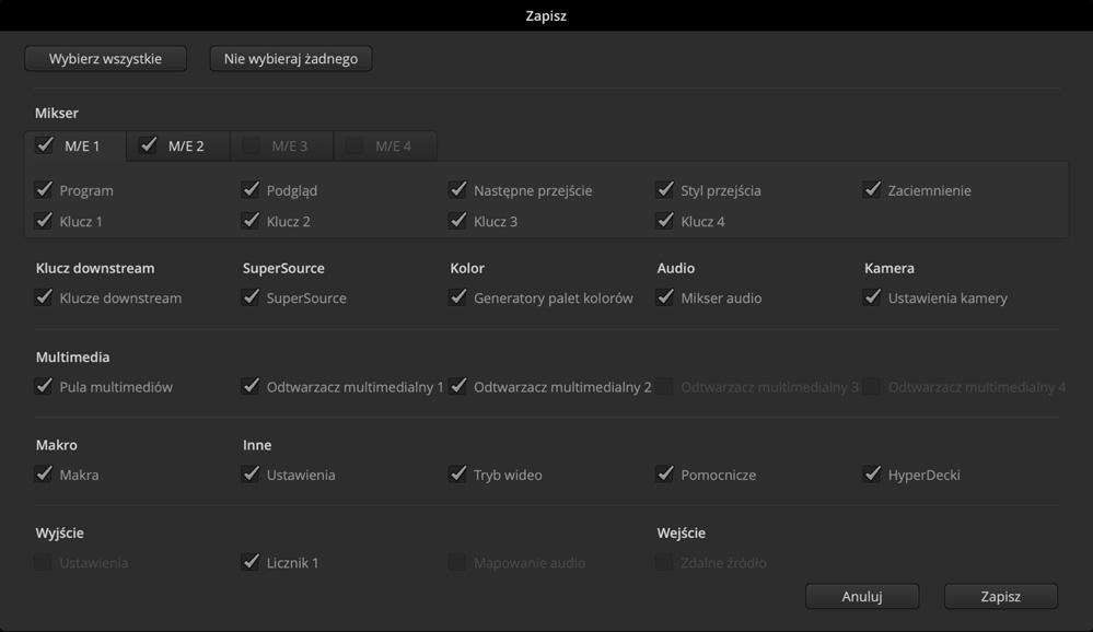ATEM Constellation pozwala na szybkie zapisanie ustawień miksera w dowolnym momencie, co oznacza, że można je natychmiast przywrócić. Stan miksera jest zapisywany jako plik XML. Aby wprowadzić zmiany, można nawet edytować pliki. Jeśli przechodzisz na ATEM Constellation z innego miksera ATEM, możesz użyć plików konfiguracyjnych XML z dowolnego innego modelu miksera ATEM, nawet z pliku konfiguracyjnego XML ATEM Mini! Wszystko po prostu działa! Stan miksera można zapisać w dowolnym momencie lub ustawić ATEM Software Control na automatyczne zapisywanie w regularnych odstępach czasu, przy czym starsze wersje plików zostaną zachowane. Podczas zapisywania stanu miksera zapisywane są nie tylko ustawienia, ale także cała zawartość puli multimediów!