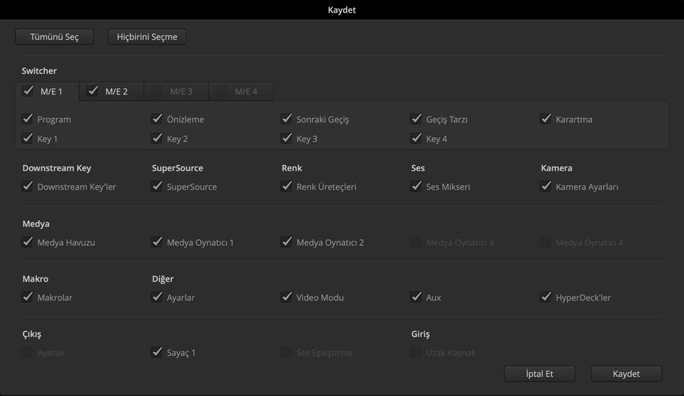 ATEM Constellation, görüntü mikseri ayarlarını çabucak kaydetmenizi sağladığı için, istediğiniz anda ayarları geri çağırabilirsiniz! Görüntü mikserinin durumu bir XML dosyası olarak kaydedildiğinden, değişiklik yapmak için bu dosyaları da düzenleyebilirsiniz. ATEM Constellation’a başka bir ATEM görüntü mikserinden geçiyorsanız, ATEM görüntü mikserinin herhangi bir modelinden gelen XML ayar dosyalarını kullanabilirsiniz, bir ATEM Mini XML ayar dosyasını bile! Sorunsuz çalışırlar! Görüntü Mikseri durumunu istediğiniz zaman kaydedebilirsiniz veya düzenli aralıklarla kaydetmesi için ATEM Software Control yazılımını ayarlayabilirsiniz ve dosyaların eski versiyonları saklanır. Görüntü Mikseri durumunu kaydederken, sadece ayarları kaydetmekle kalmaz, aynı zamanda medya havuzu içeriğinin tamamını kaydedersiniz!